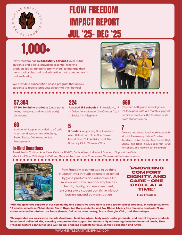 At Gentle Gratitude, we believe no student should have to miss school due to a lack of access to menstrual products or hygiene essentials. Our Flow Freedom program is a commitment to health equity, providing free pads, tampons, deodorant, wipes, and more to students across Philadelphia and beyond.